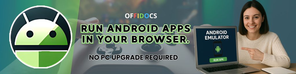 The good news is that there’s now a fast, free, and browser-based solution: MyAndroid, the online Android emulator from OffiDocs. It lets you upload APK files and run them directly from your browser — no downloads, no installations, and no need for a high-end PC.