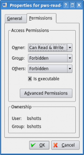 Here we can see the settings for the owner, group, and world. In KDE, clicking the “Ad- vanced Permissions” button brings up another dialog that allows you to set each of the mode attributes individually. Another victory for understanding brought to us by the com- mand line!
