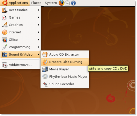 Besides copying audio tracks from a CD to your computer, Ubuntu also enables you to copy music files from your computer onto a CD or DVD. Brasero is the CD/DVD burner application that comes bundled with Ubuntu, by default. It is an easy-to-use application that also allows CD/DVD data disc creation, CD/DVD copying and burning of existing images to CD/DVD.