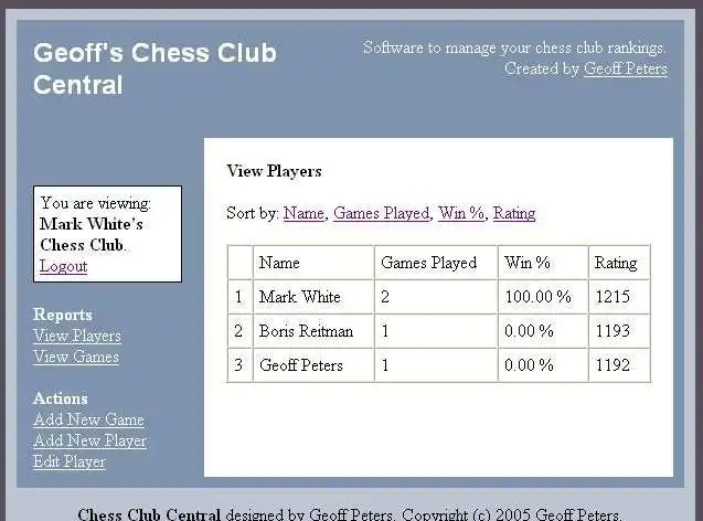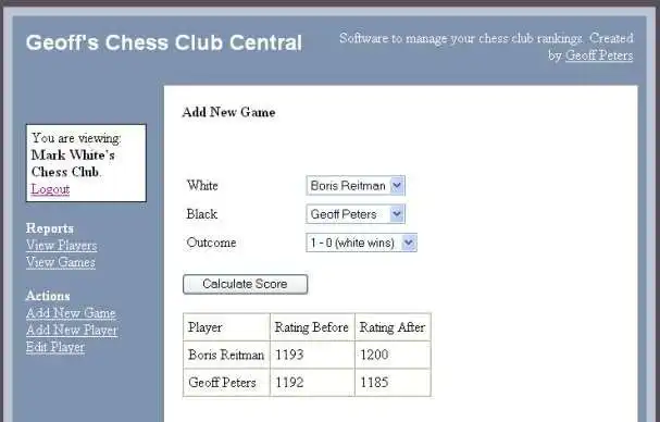 PHP/MySQL software for managing rankings for amateur chess clubs, such as for school groups or other groups of chess enthusiasts. It uses a standard chess rating formula that can be modified to suit your club. Data entry for game results and player infoAudience