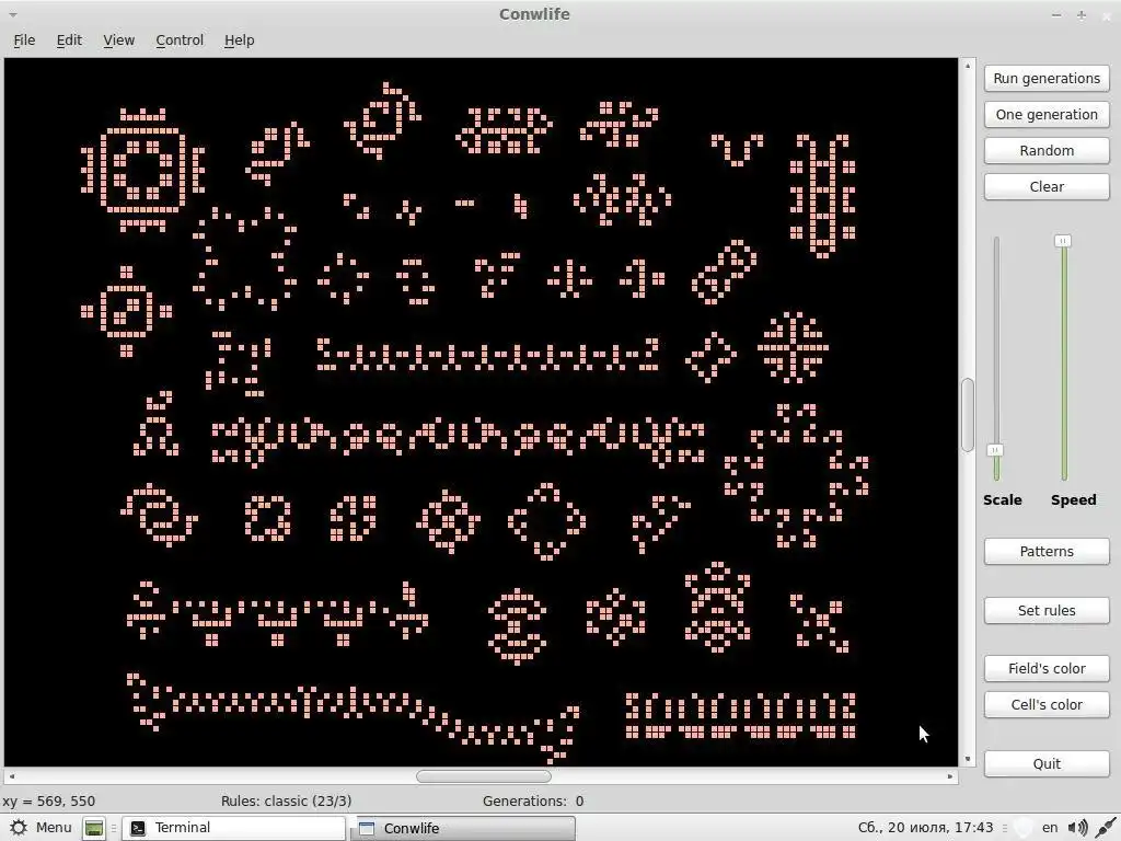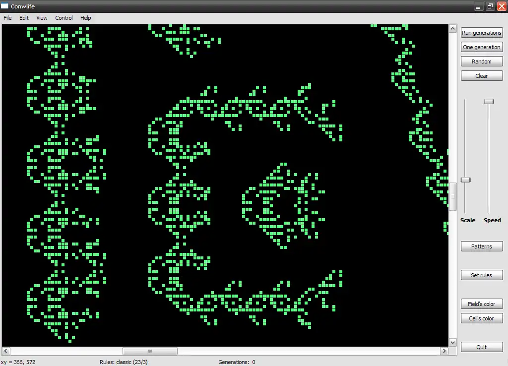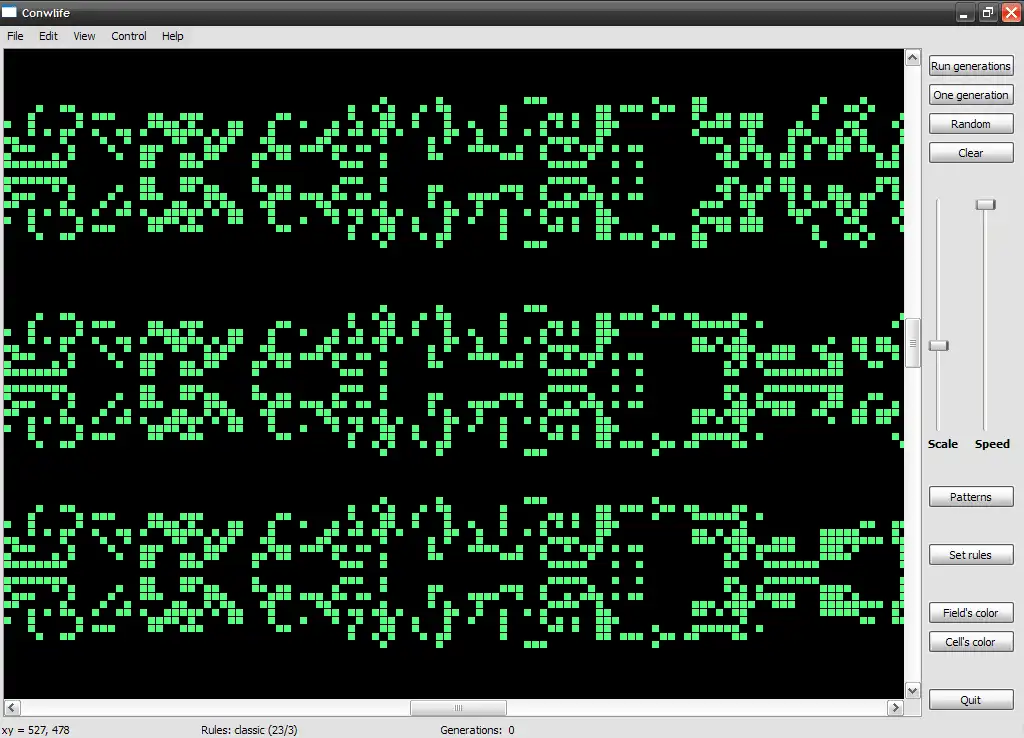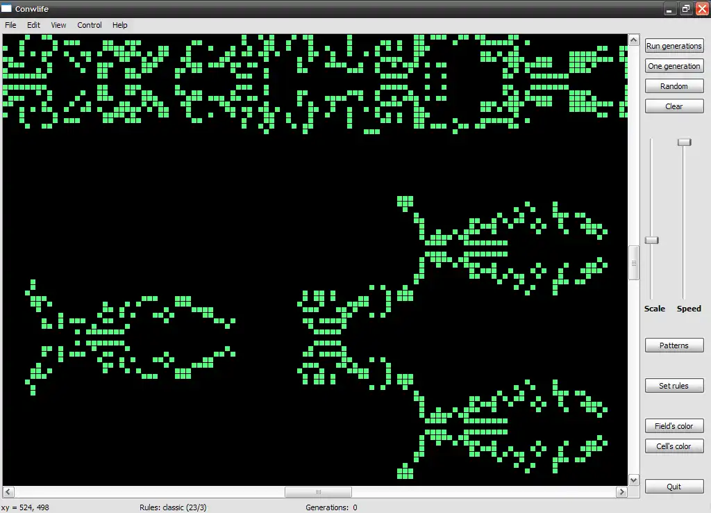 Conwlife is a Game of life implementation. Game of life is a popular mathematics game that was invented by John H. Conway in 1970. It's have very simple rules which lead to the creation of beautiful and amazing patterns.