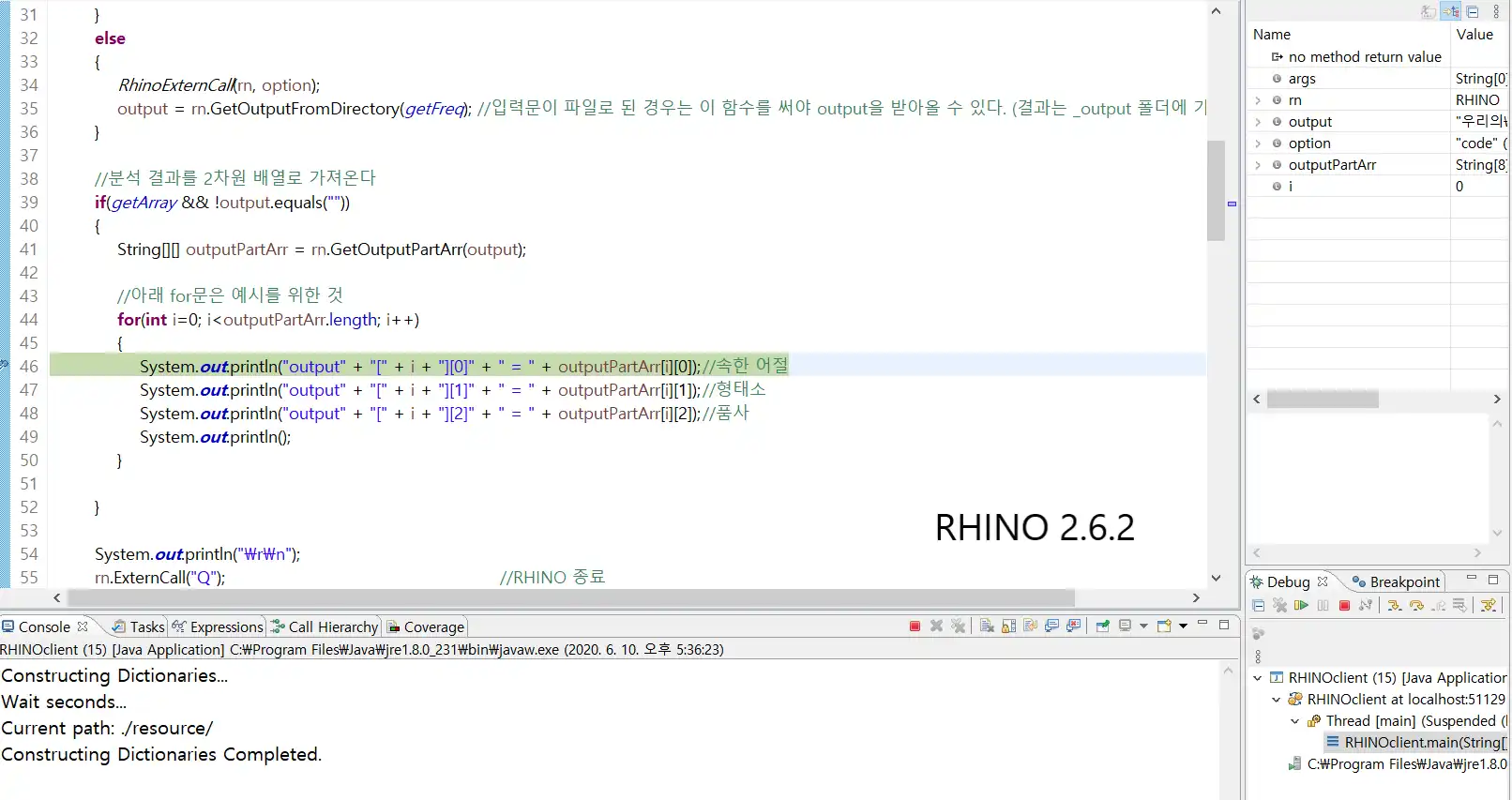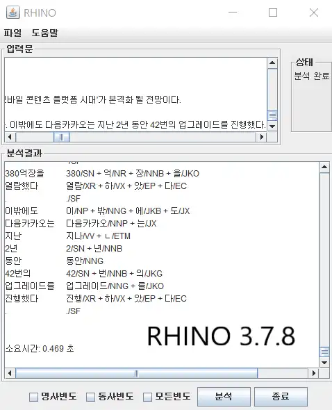RHINO parses Korean words by morpheme and part-of-speech. Its dictionaries are based on Korean Modern Tagged Corpus(12 million phrases scale) which was made by Korean government. So it analyses many cases of stems and endings. And the newly developed Dynamic Dictionary Technology can make words to react with their context. That is, a programmed database. For more information see the files in the help folder.Features