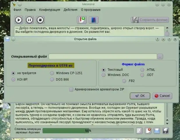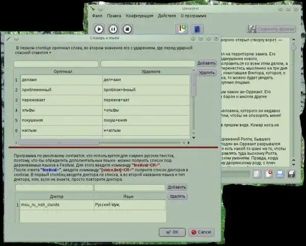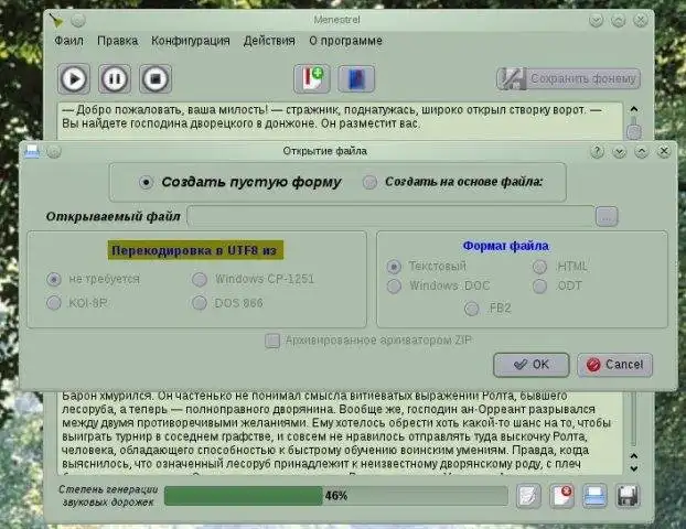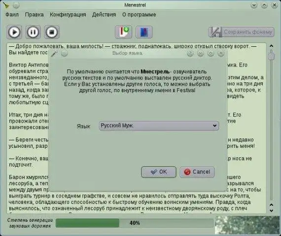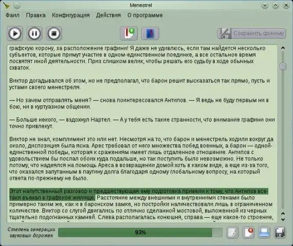Menestrel-Graphics system designed conveniently say (listen) texts, with the format txt, doc, odt, html, and fb2, which may be in zip-form. Festival TTS engine is used with a Russian voice