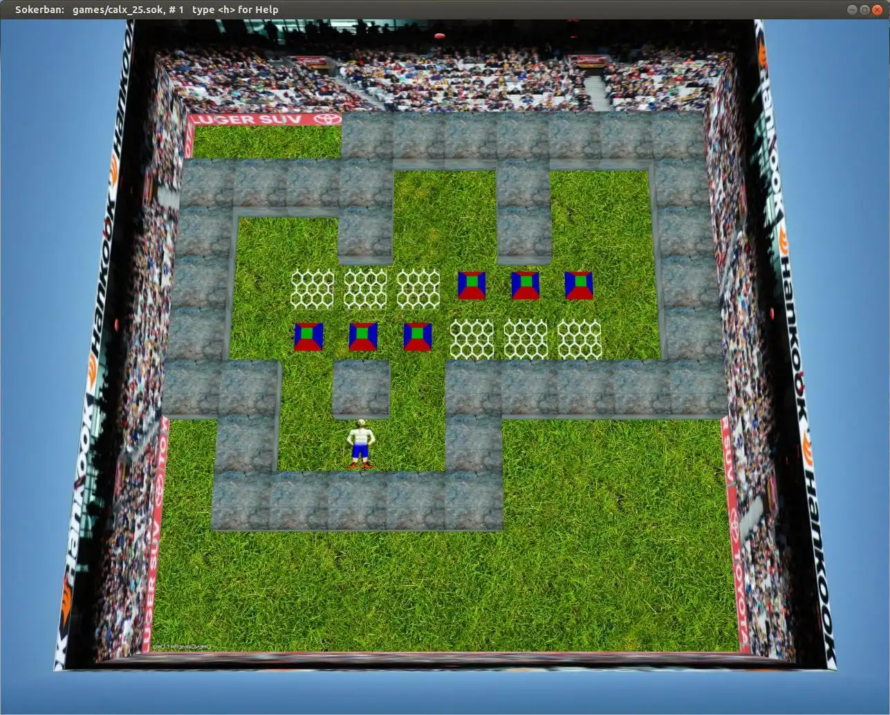 This is a soccer-themed, 3rd-person 3D sokoban puzzle game. It uses data in a format that is commonly found on the internet.It has undo <u> and restart <r> functions. Comes with many puzzle files, each typically having dozens of "levels". The next <n> and previous <p> keys move between levels. The <Lshft> and <Rshft> keys move between the different puzzle files. The <z> key creates a setpoint (reZero) so that subsequent restarts restore that setpoint.