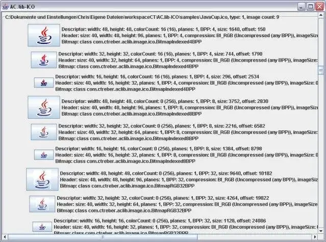 AC.lib-ICO is a Java 1.4+ library/stand alone program to read image files in MS ICO format (i.e., favicon.ico) from URLs, files, buffers, or streams, and convert them to Image objects (library) or display them (stand alone program).