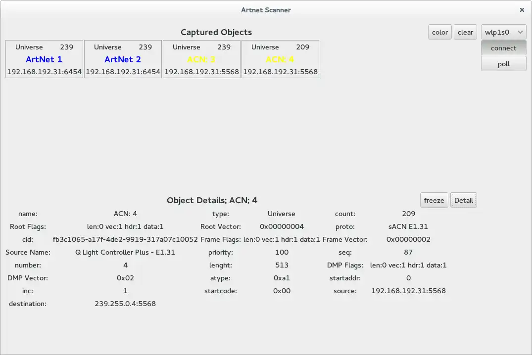 Network Analyzer for lighting protocols like Art-Net, ACN, MA-Net and Compu-Net. Allows to display DMX data and discovers connected Desks