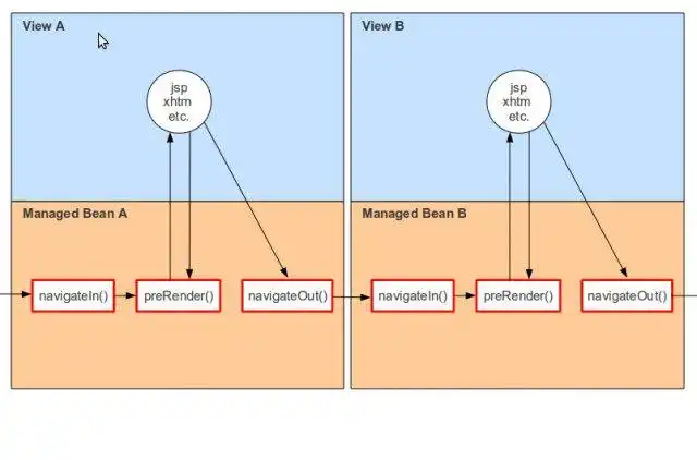 Asterion for JSF is a library for JSF web applications that provides the execution of managed-bean's methods when each page is being entered, displayed and left. The methods navigateIn(), preRender() and navigateOut() are automatically executed.