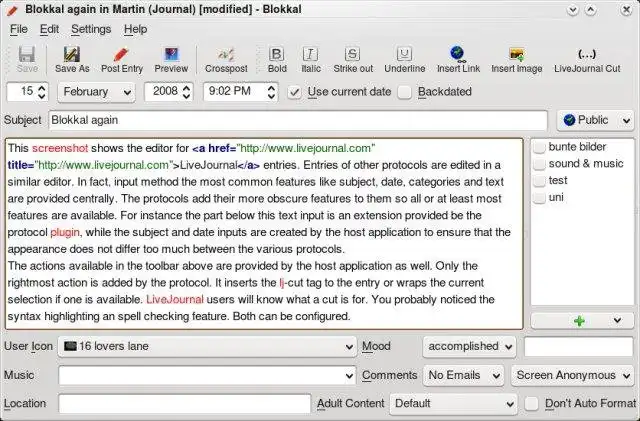 Blokkal is a KDE blogging client designed to support multiple protocols and blogging sites. The goal is to provide a uniform way to access the most commonly used blogging systems.Audience