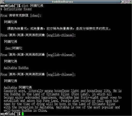 A Buddhadharma dictionary project (budict - Buddha Dict) using standard DICT protocol. The project includes dictionaries of English-English, English-Chinese, Chinese-English, and Chinese-Chinese. The original data was from Electronic Buddhadharma Society