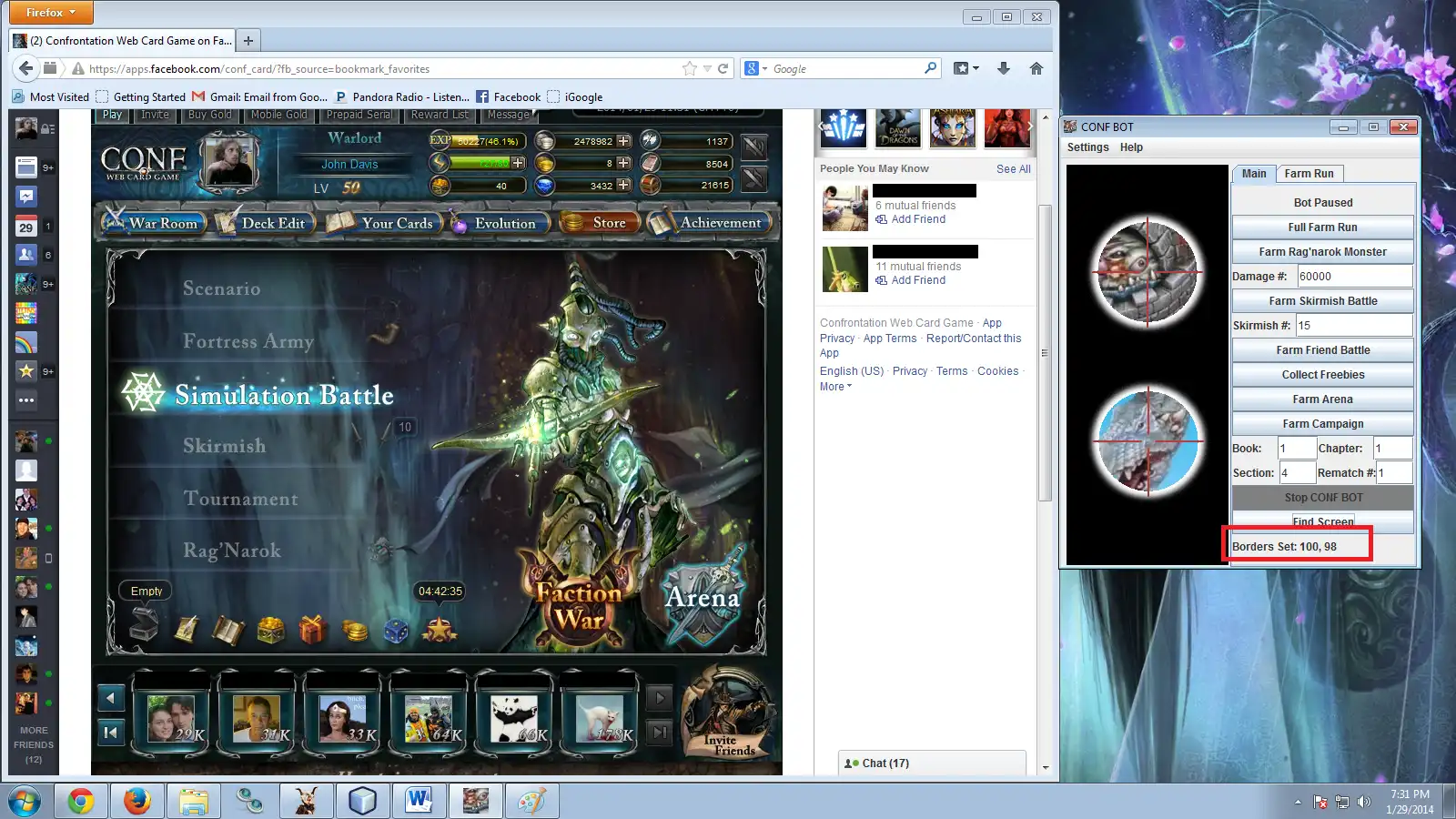 CONF Bot will play the Facebook game Confrontation for you, automating clicks so you don't have to repeat the same action 40 or 50 times in a row for no good reason.It also allows actions to be sequenced together in whatever order you prefer, allowing full farm runs of the game's content that can save hours a day.