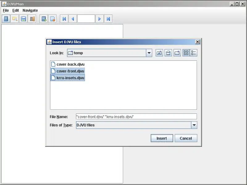 GUI for manipulating djvu files. Can combine some files, insert some files into existing djvu file, delete pages from djvu file. Has preview window. Based on utility djvm.exe from DjVuLibre package.
