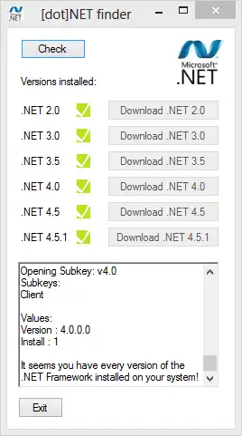 Just a small tool that looks in the registry and finds which versions of the .NET Framework are installed on your PC. It shows a decent output of what it's doing and offers you download links to the versions you don't have installed.