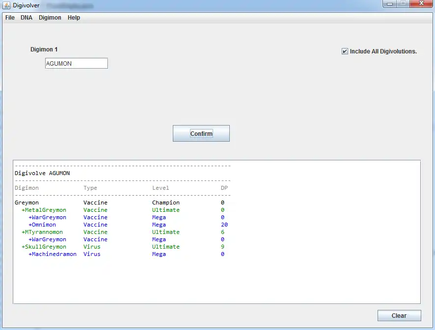DW2 Digivolver is a JAVA developed software that aims to facilitate the creation of your Digimon World 2 team throughout the game. The software tries to create a friendly interface for the user to discover the easier ways to get a wanted Digimon via the DNA Digivolution system using an extensive database.