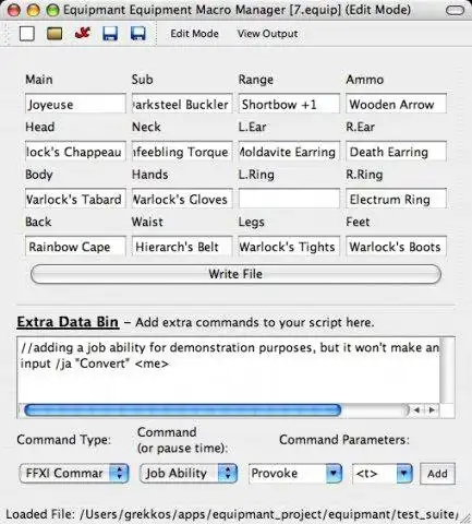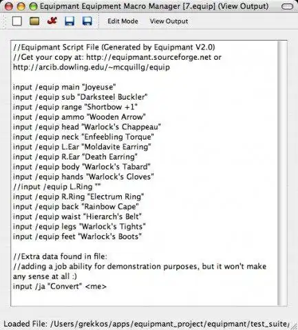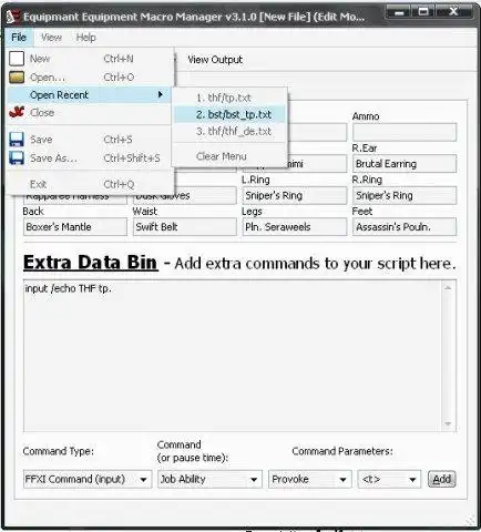 Equipmant is a program designed to create equipment script files for the Final Fantasy XI Windower. Create macros in FFXI to use these scripts and they will change equipment quickly, even making it possible to change all equipment in a single macro.Features
