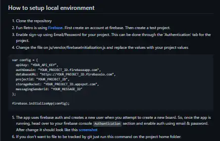 Easy to use and beautiful retrospective board. Fun Retro is using Firebase. First create an account at firebase. Then create a test project. Enable sign-up using Email/Password for your project. This can be done through the 'Authentication' tab for the project. The app uses firebase auth and creates a new user when you attempt to create a new board. So, once the app is running, head over to your firebase console Authentication section and enable auth using email & password.