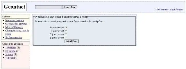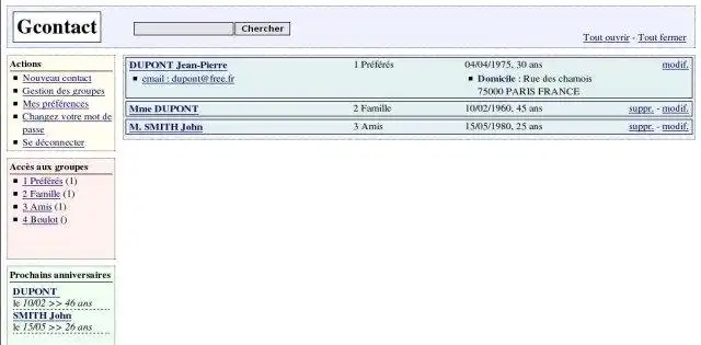GContact is a Web based address book in Ajax/PHP : multi-user, multi-contacts (email,phone,icq,msn,...) & multi-address for each person, birthday reminder by email, mailing-list management, Excel export, ...