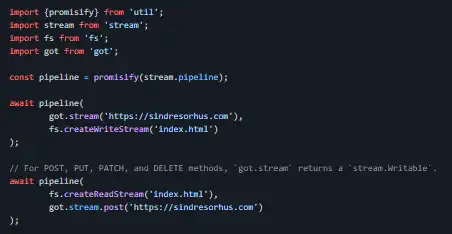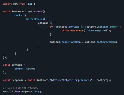 Got implements RFC 7234 compliant HTTP caching which works out of the box in-memory and is easily pluggable with a wide range of storage adapters. Got uses Keyv internally to support a wide range of storage adapters. For something more scalable you could use an official Keyv storage adapter. Hooks allow modifications during the request lifecycle. Hook functions may be async and are run serially. Got will make no further changes to the request before it is sent. This is especially useful in conjunction with got.extend() when you want to create an API client that, for example, uses HMAC-signing. You can override the request function by returning a ClientRequest-like instance or a IncomingMessage-like instance. This is very useful when creating a custom cache mechanism. The response object will typically be a Node.js HTTP response stream, however, if returned from the cache it will be a response-like object which behaves in the same way.