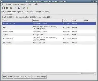 The Grace Contribution Manager handles the tracking of contributions and donors for a non-profit organization. Grace runs on both Linux and Windows. Grace is no longer hosted on SF.net. Please see http://code.google.com/p/gracedm