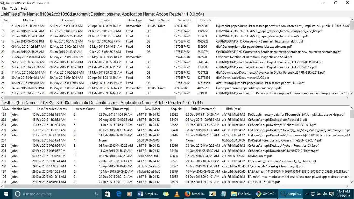 JumpListExt (Jump List Extractor) is a GUI tool that parses the Jump Lists in Windows 10, individually as well as collectively. JumpListExt focuses on parsing and displaying the parsed data on user interface. The developed software tool can also export the parsed data into a SQLite database by selecting the 'Export' button in File menu of software.Features