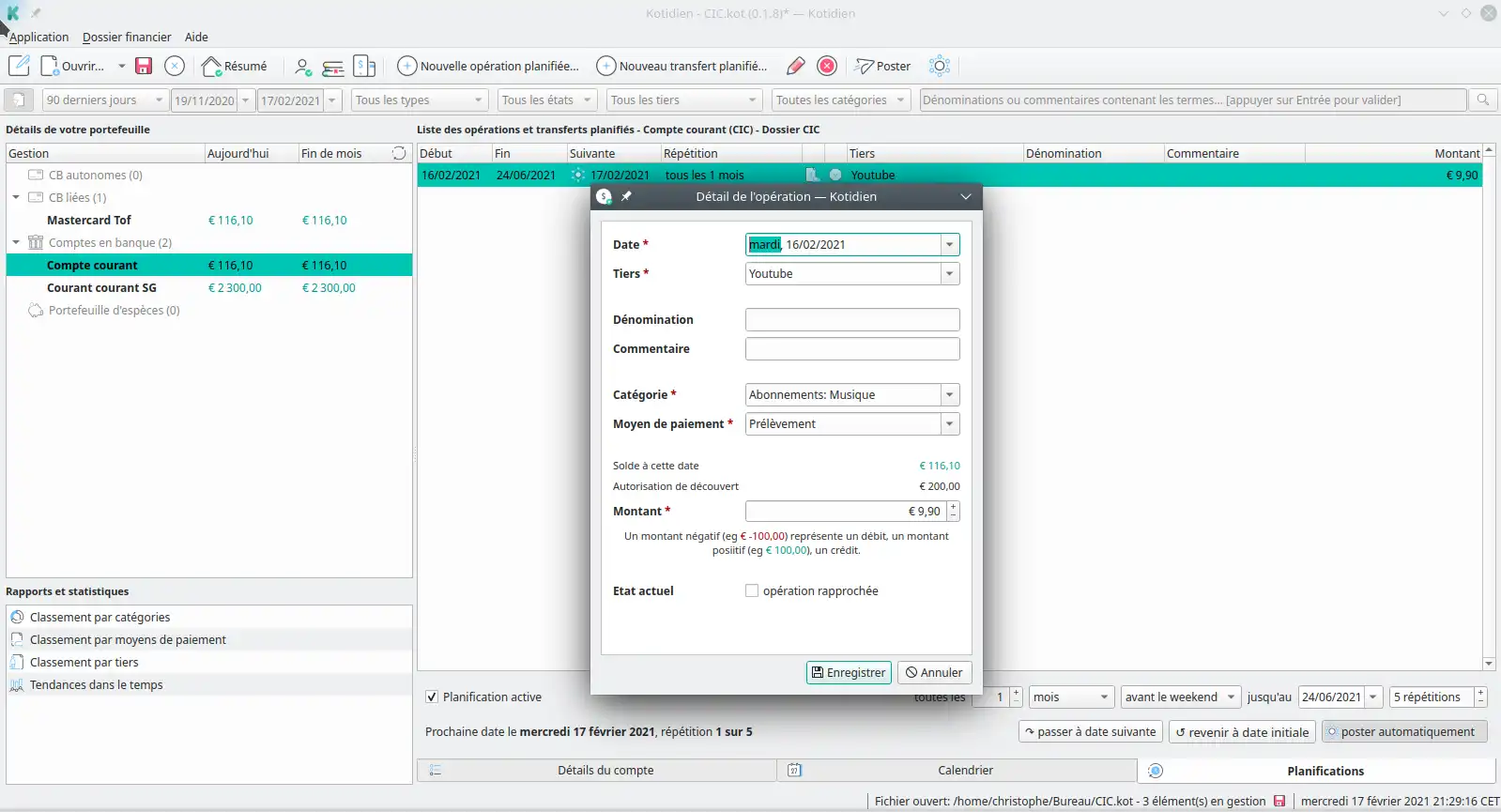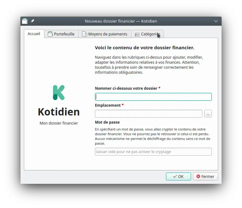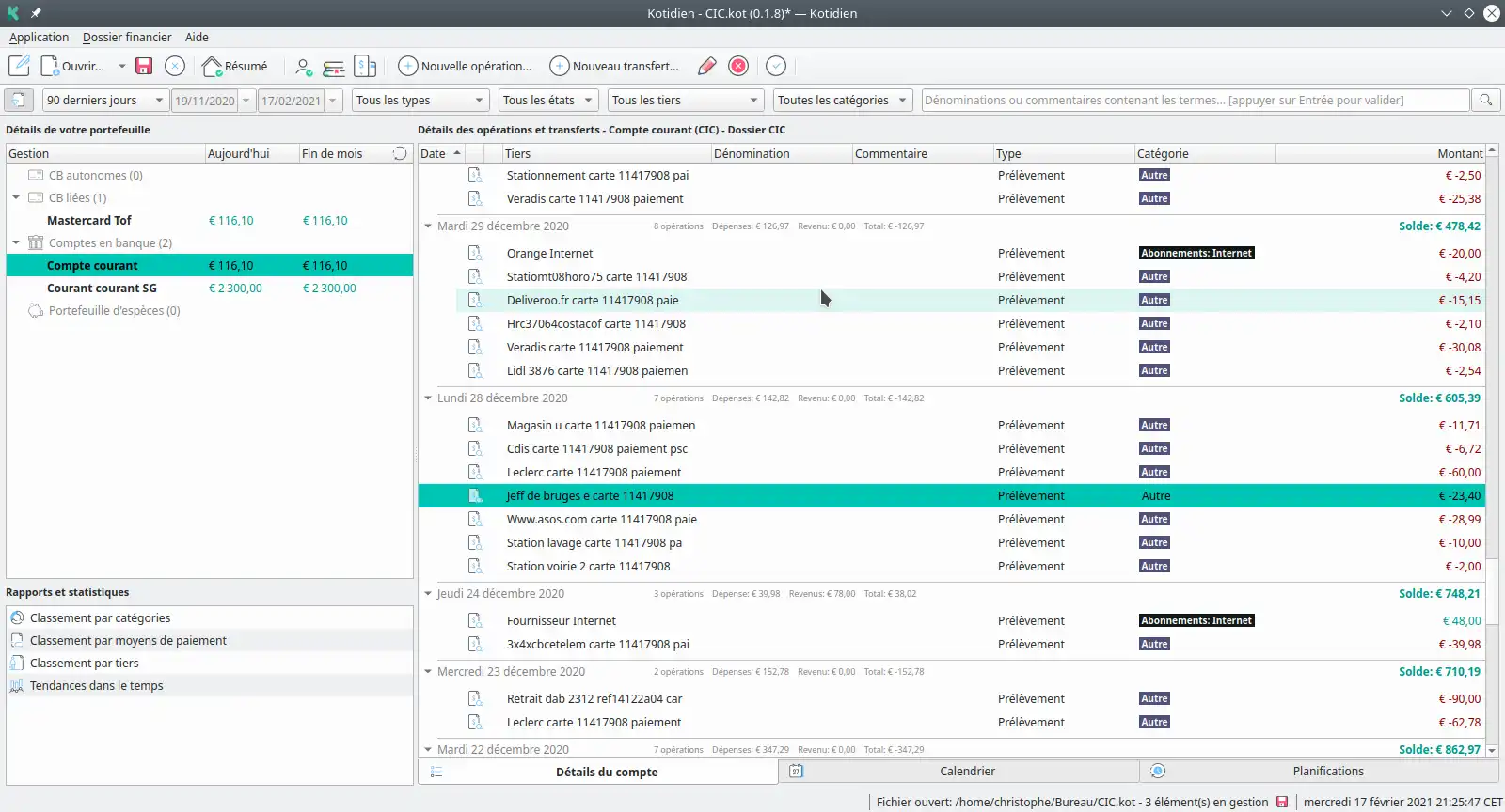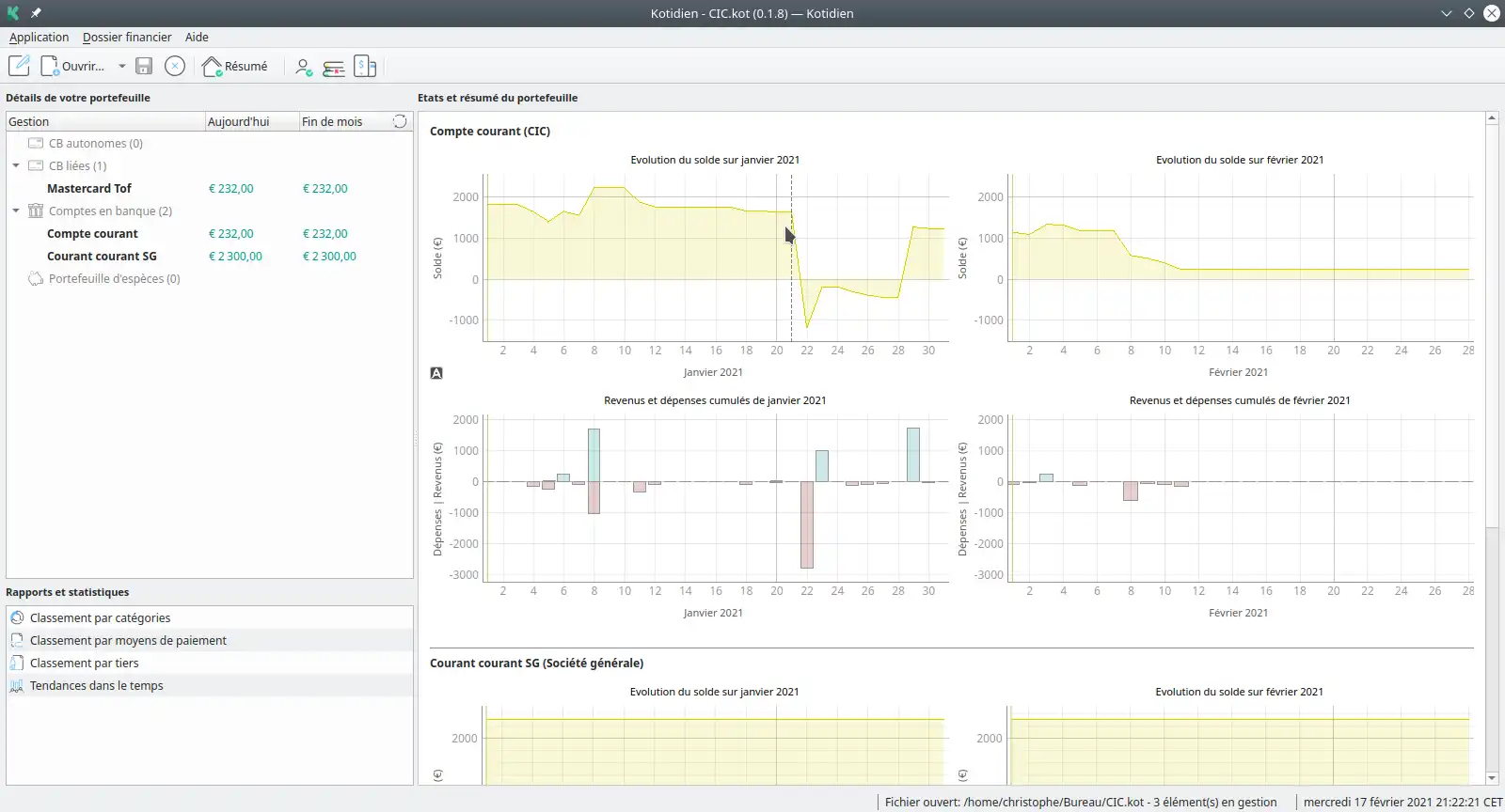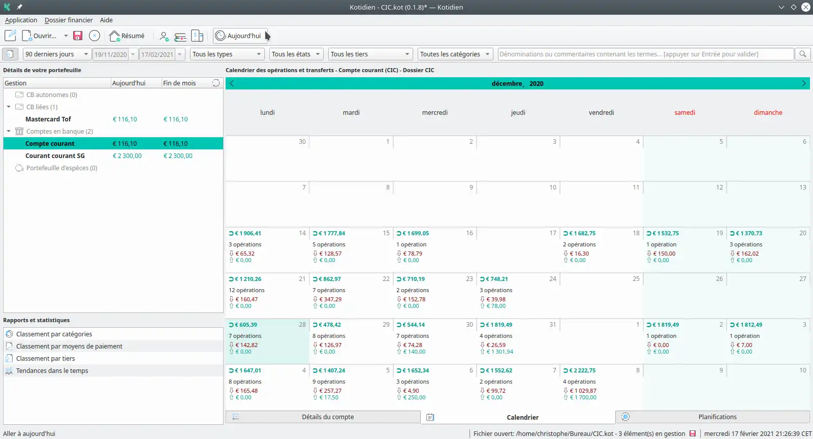 Kotidien est une application dédiée à la gestion de votre argent. Comptes bancaires, cartes de paiements autonomes, et portefeuille d'espèces. Totalement libre et gratuite, elle vous permets de tenir vos comptes d'une main de fer. Écrite en Python 3 et compatible Linux (intégration parfaite sous KDE via l'utilisation de QT 5.12), Microsoft Windows 7 et supérieurs, Mac OS 10.11 et supérieurs.