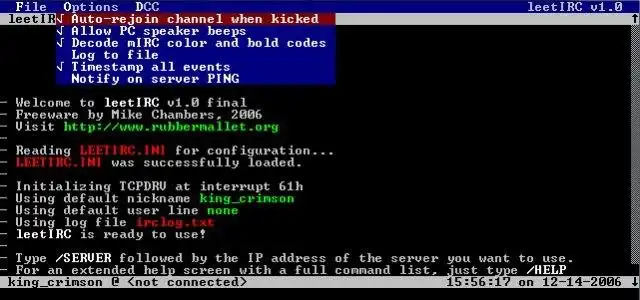 leetIRC is a freeware Internet Relay Chat (IRC) client designed for maximum functionality on older/obsolete systems running MS-DOS or 100% compatible OS (win32 port also, soon). Main features include drop-down menus, DCC file receive, mIRC color/bold cod