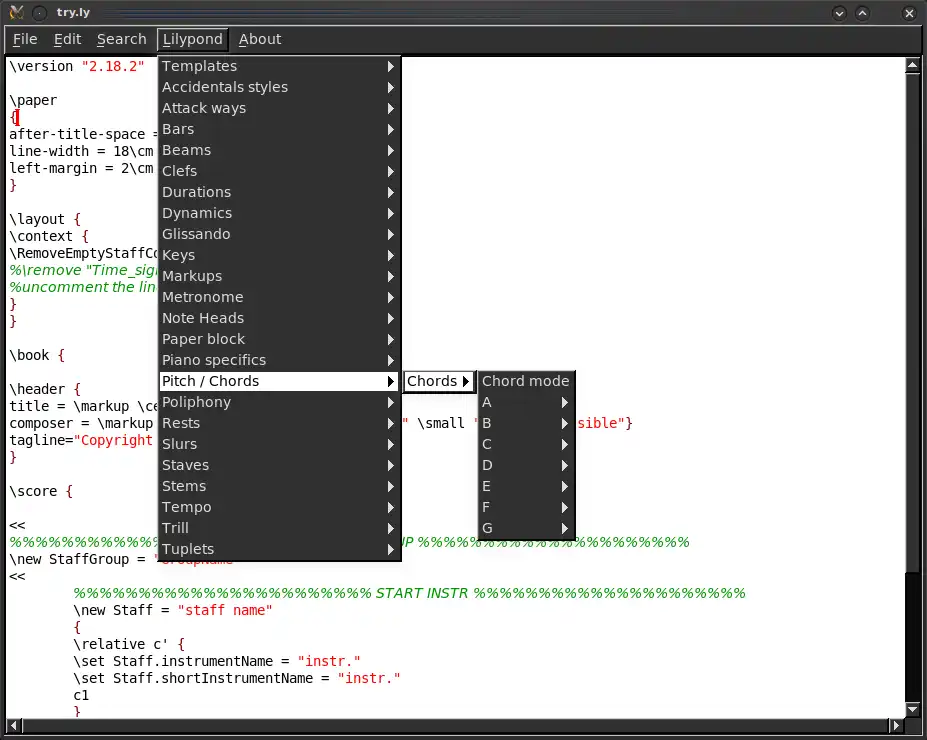 Lied is a FLTK text editor (with some modifications) with the addition of a specific menu that collects several definitions in Lilypond syntax ordered by argument.User interface
