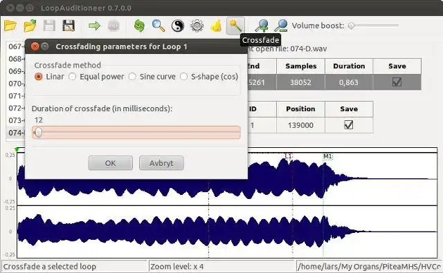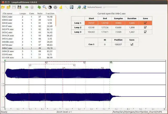 LoopAuditioneer is a software that allows users to create, listen to and evaluate loops and cues embedded in .wav file headers. The user can choose which ones to keep and easily autosearch for good natural loop points. It's mainly intended for audio samples being processed for virtual pipe organs.