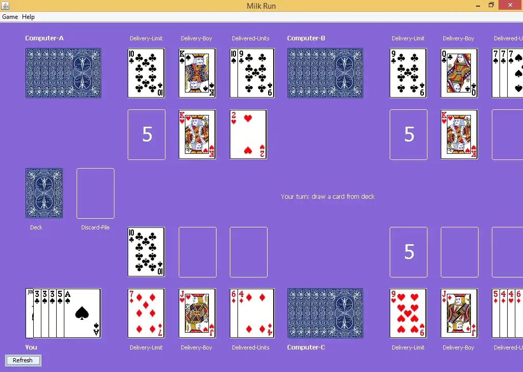 MilkRun is a card game where you must deliver chocolate and strawberry milk, while encumbering your opponents' ability to do so. Play against 3 computer opponents in this exciting game.Make sure Java 8 is installed. Download the ZIP, extract it to a folder, and run the file "MilkRunCardGame.jar" to start playing.