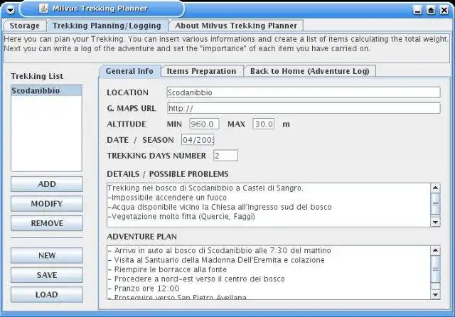 Milvus Trekking Planner is a trekking planning and logging software developed by Giovanni Santostefano to help the trekker to plan and make an history of trekkings. Works with GNU/Linux, Windows, MacOS, OSX, *BSD and all platforms supporting JavaAudience