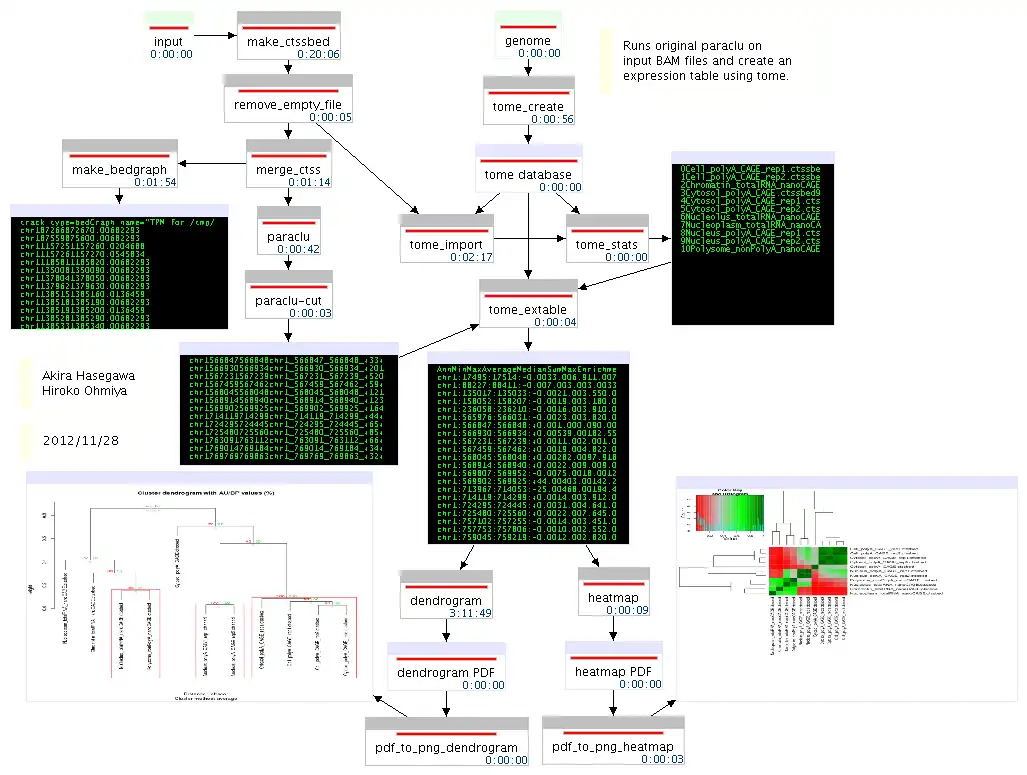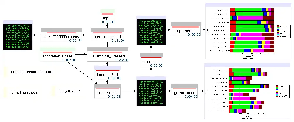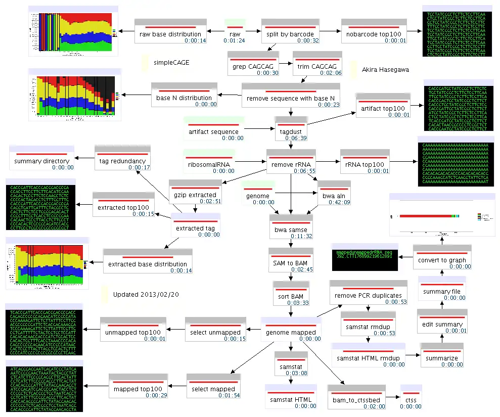 Cap analysis of gene expression (CAGE) is a sequencing based technology to capture the 5’ ends of RNAs in a biological sample. After mapping, a CAGE peak on the genome indicates the position of an active transcriptional start site (TSS) and the number of reads correspond to its expression level. CAGE is prominently used in both the FANTOM and ENCODE project.