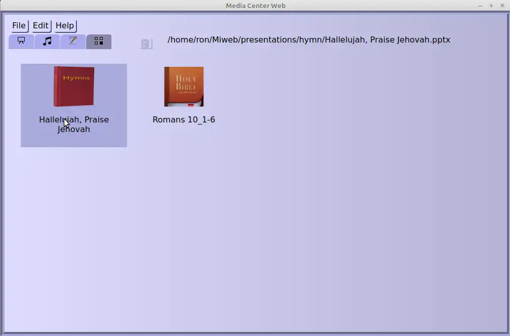 Create and display presentation files containing hymns from 2 included databases of public domain hymns. Create and display presentation files containing Bible passages. Organize worship flow by sequencing multiple presentation files. Windows users should review the Files/README.txt file prior to downloading the installer.