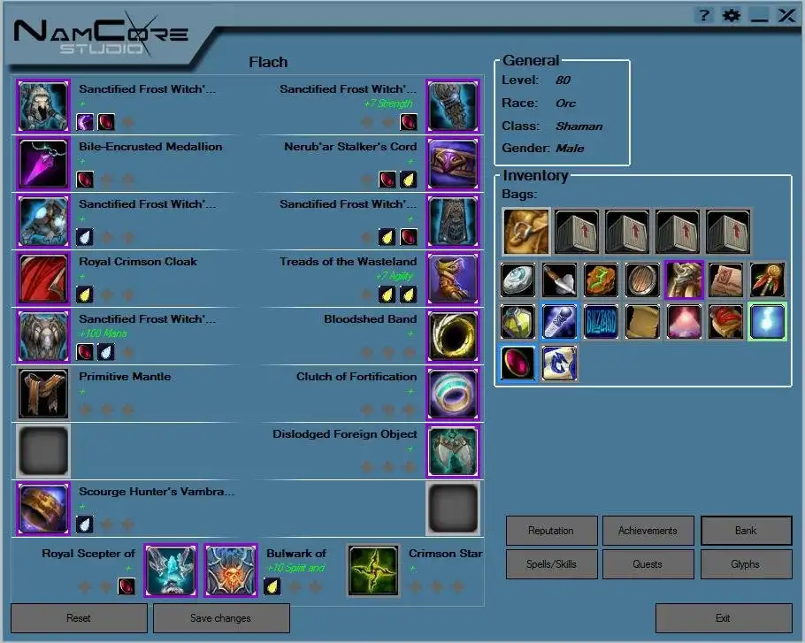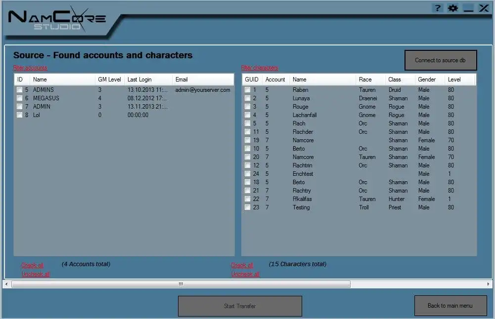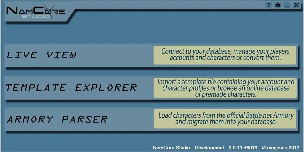Note: This application is in development.Namcore Studio provides a professional environment to manage account and character data of your World of Warcraft Server. While supporting almost all popular emulators/cores, this easy-to-use application allows you to: