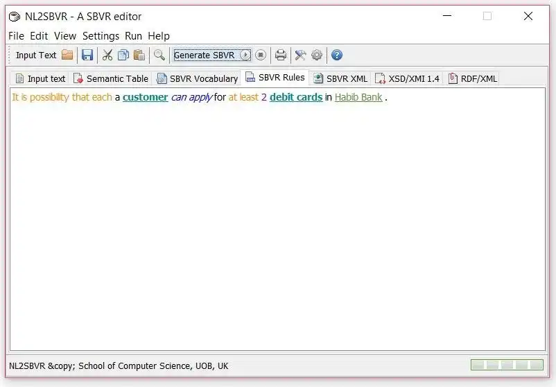 This is the Linux app named NL2SBVR whose latest release can be downloaded as NL2SBVR-0.0.3.0-bin.zip. It can be run online in the free hosting provider OnWorks for workstations.