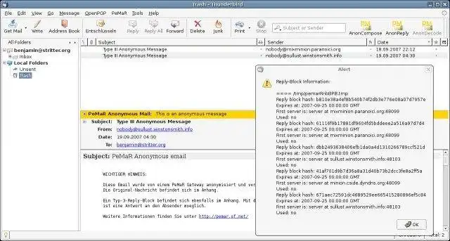 PeMaR is a gateway, that relays outgoing email to anonymous remailer networks and receives and decodes anonymous mixminion messages. It allows the use of any email client to send and receive anonymous email. An extension is available for Thunderbird.