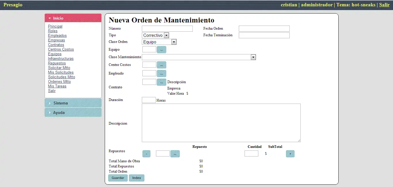 Software para la administración del mantenimiento hospitalario en instituciones promotoras de salud en Colombia. El sistema soporta solicitudes Mantenimiento, Ordenes de Servicio, repuestos, equipos, infraestructura, seguridad, empleados y generación de reportes para la gestión de informes del área. Para más detalles y ver un demo revisar el wiki del proyecto