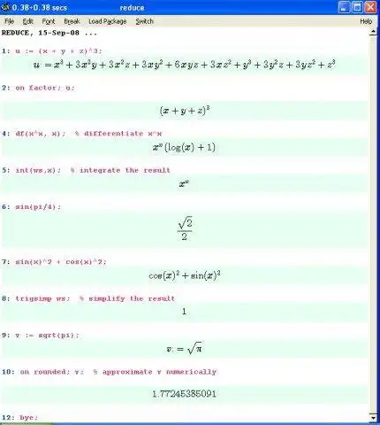 REDUCE is an interactive system for general algebraic computations of interest to mathematicians, scientists and engineers. It can be used interactively for simple calculations but also provides a flexible and expressive user programming language.