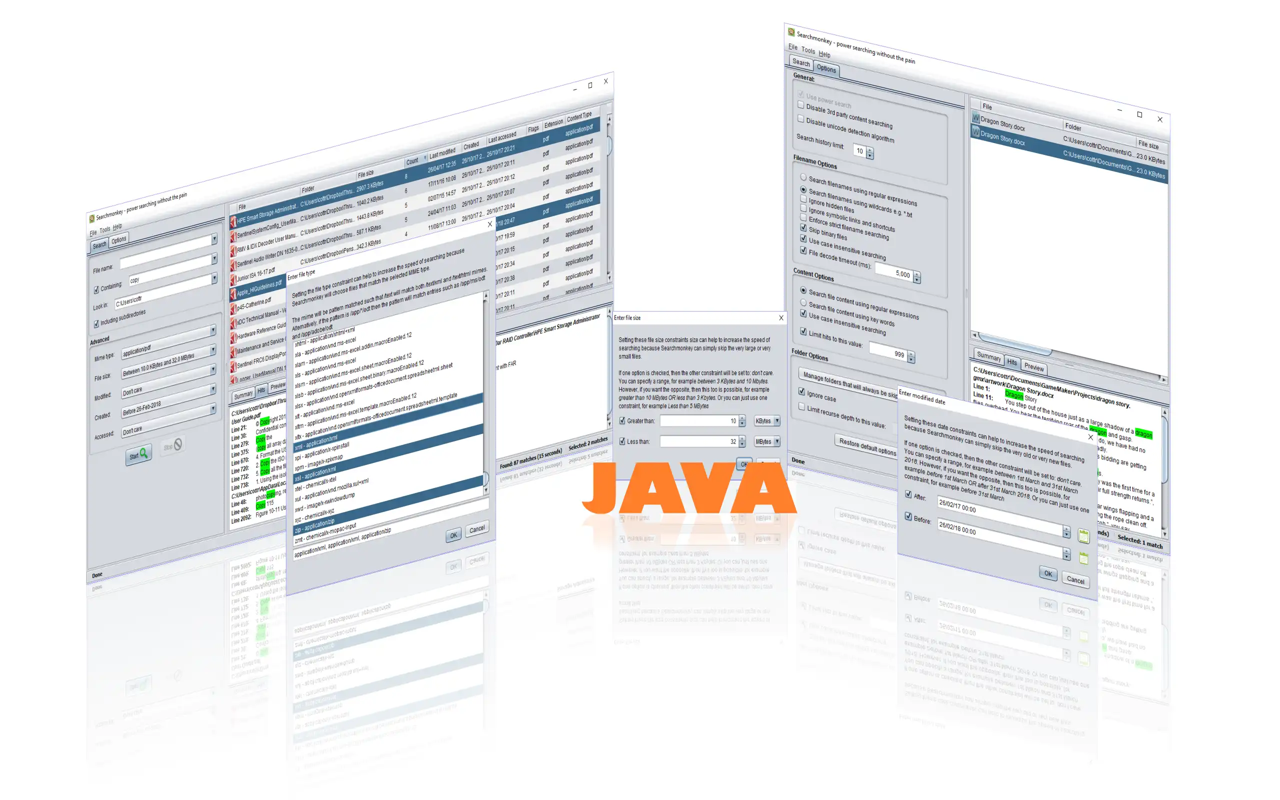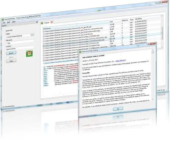 Power searching on your desktop without the pain. Perform powerful desktop searches without having to index your system using regular expressions. Graphical equivalent to find/grep. Available for Windows (JAVA) and Linux (Gnome & KDE) and easy to translate into your locale.