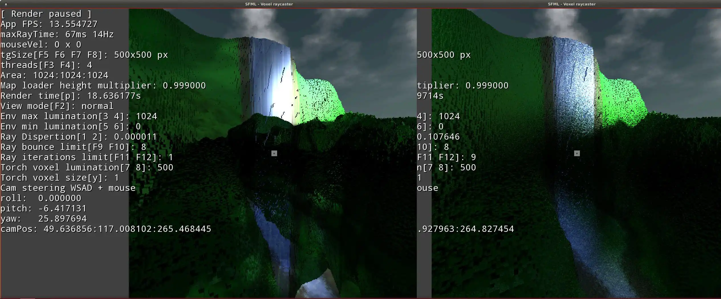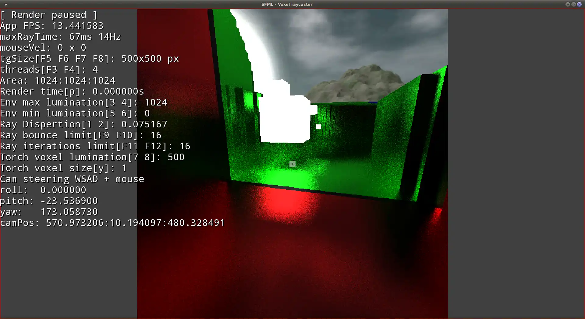 Voxel raycasting engine written in C++ drawed by SFML, curently in alpha preview state. Currently rays are computed by CPU and performance is low and far away from realtime.Features