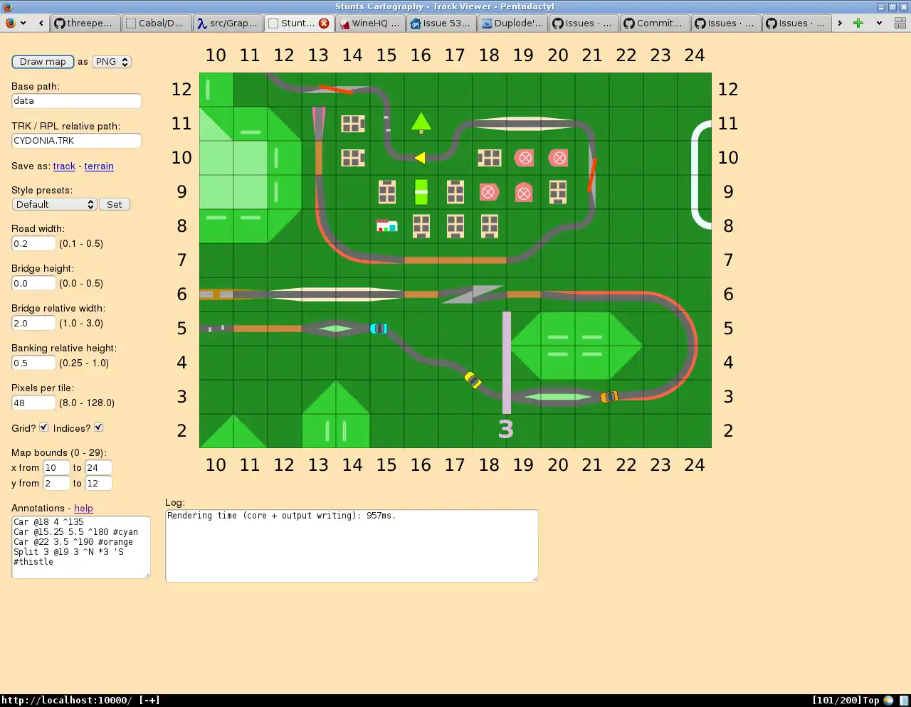 Power tools for track map rendering and analysis for the classic racing game Stunts. Powered by the Haskell libraries Diagrams(vectorial rendering backend) and Threepenny (browser-hosted frontends). Currently there is a functional, if unpolished, configurable track viewer, as well as experimental code for some other features. Note that this repository is an up-to-date clone of the official one at https://bitbucket.org/duplode/stunts-cartographyAudience