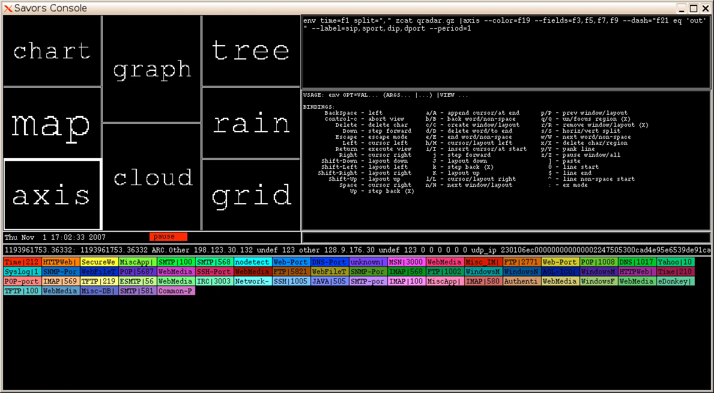Savors is a visualization framework that supports the ingestion of data streams created by arbitrary command pipelines. Any number of data streams can be shown synchronized by time in the same or different views, which can be arranged in any layout. These capabilities combined with a powerful parallelization mechanism and interaction models already familiar to administrators allows Savors to display complex visualizations of data streamed from many different systems with minimal effort.Audience
