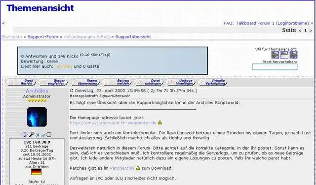 The Talkboard Forum tries to mix the good ideas from other BBs with its own. It supports everything you can expect from a modern bulletin board and provides a fast and easy interface.