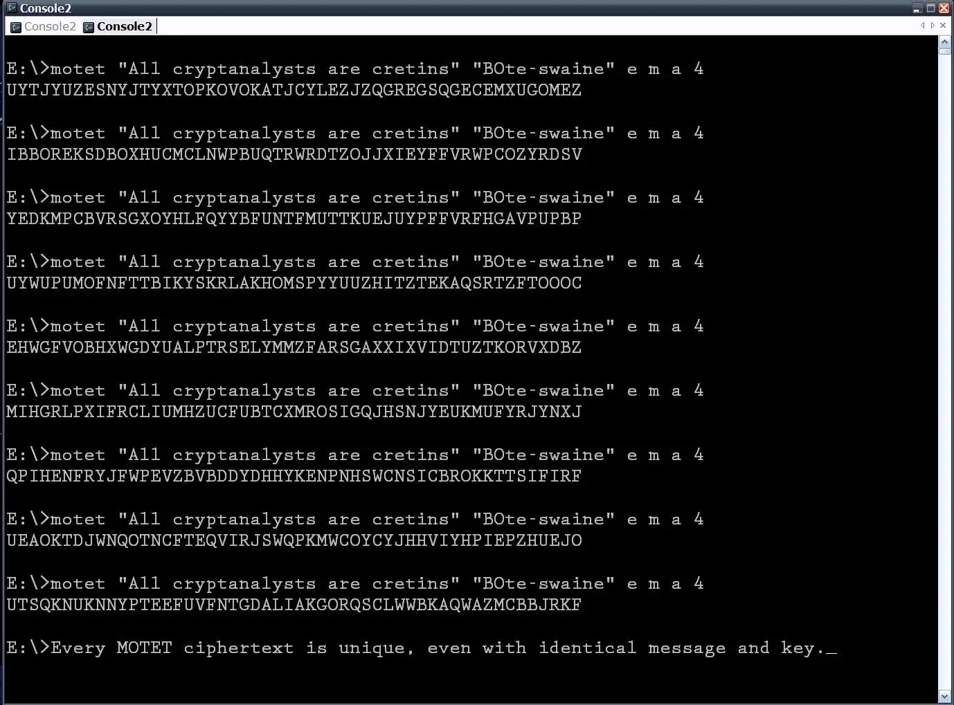 MOTET brings multiple levels of encryption, including a ciphertext-hash, a Vigenere mixing function, a choice of Caesar MOD or Caesar MIX ciphering on the primary key-stream, plus a deeply scrambled "outer shell" as a final super-encryption stage. A unique nonce IV guarantees that each ciphertext will differ radically from every other, even on the same message and identical key.