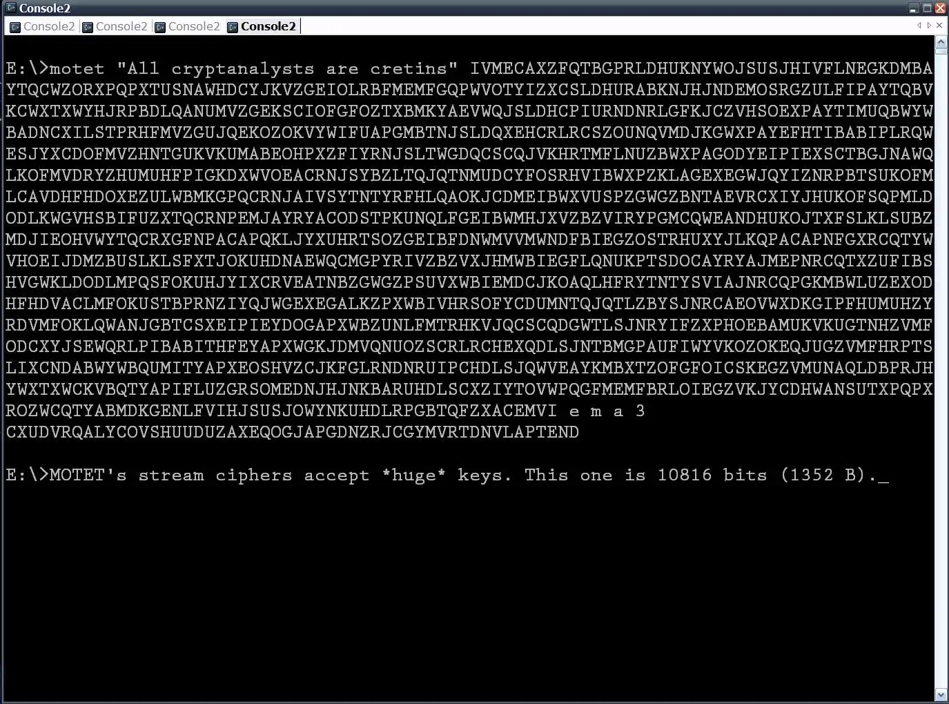 - MOTET's ciphers accept huge keys: from 256 bits (MOTE8) to 16384 bits (BB512)