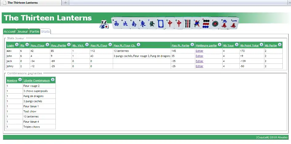 Web application for recording Mahjong scores. The application records combination and calcultate automatically points. Player statistics can be edit for all games played. Please see home page for more details http://mastermahjong.sourceforge.net