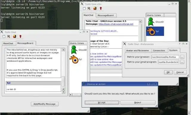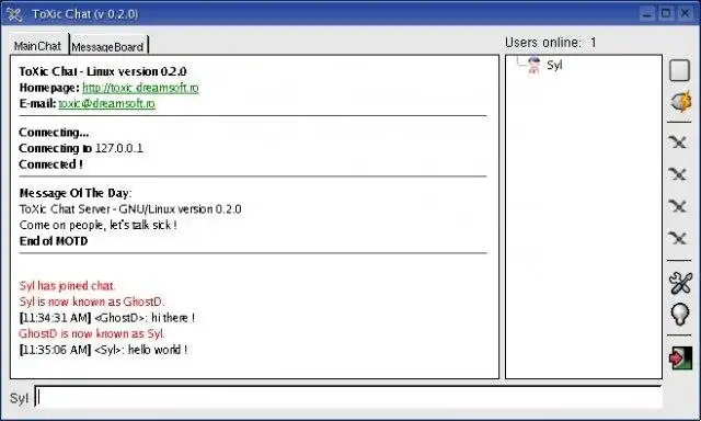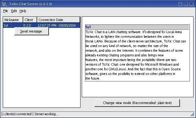 ToXic Chat is a server-client, cross-platform, LAN chatting software. It combines many features found in other chat programs but has other unique features too.