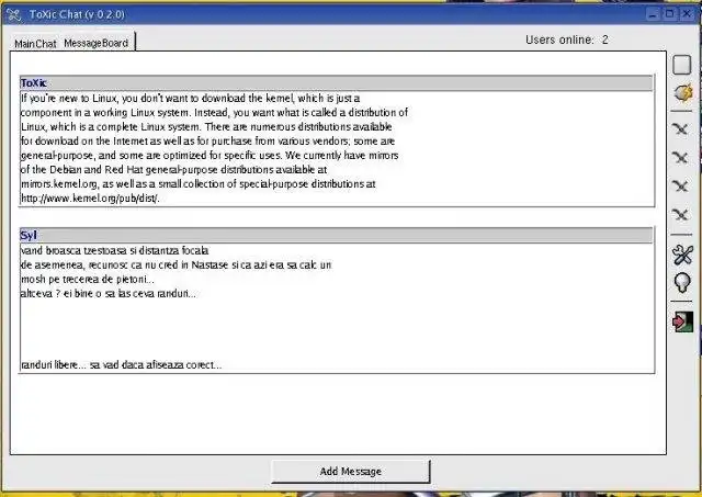 This is an application that can also be fetched from https://sourceforge.net/projects/toxic-chat/. It has been hosted in OnWorks in order to be run online in an easiest way from one of our free Operative Systems.
