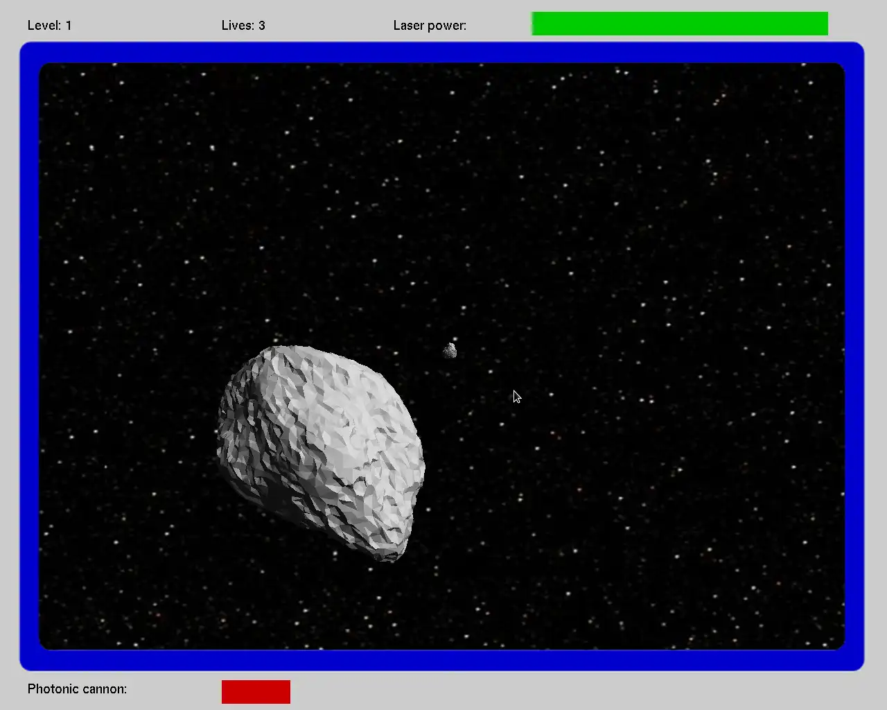 3D fasteroids is a game in which you are a captain of a starship which is in danger of being destroyed by many flying asteroids. The goal of the game is to destroy all the asteroids before they destroy your ship.User interface