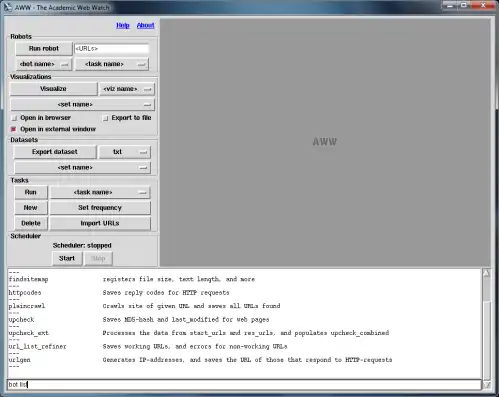 AWW controls a selection of web robots, that collect information about how web sites change over time. It stores this information, and can export it in various ways.The included robots are few and simple, but it is easy to include more, depending on what information should be collected. AWW is mainly a control centre, that executes tasks, and stores the results. Initially the goal is not to provide a lot of functionality, but rather to make something that is easily extendible.