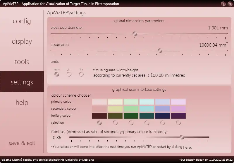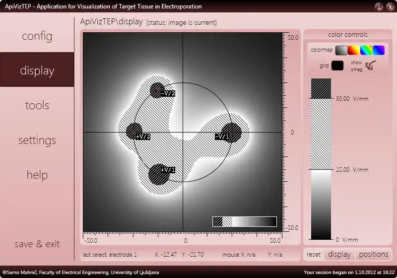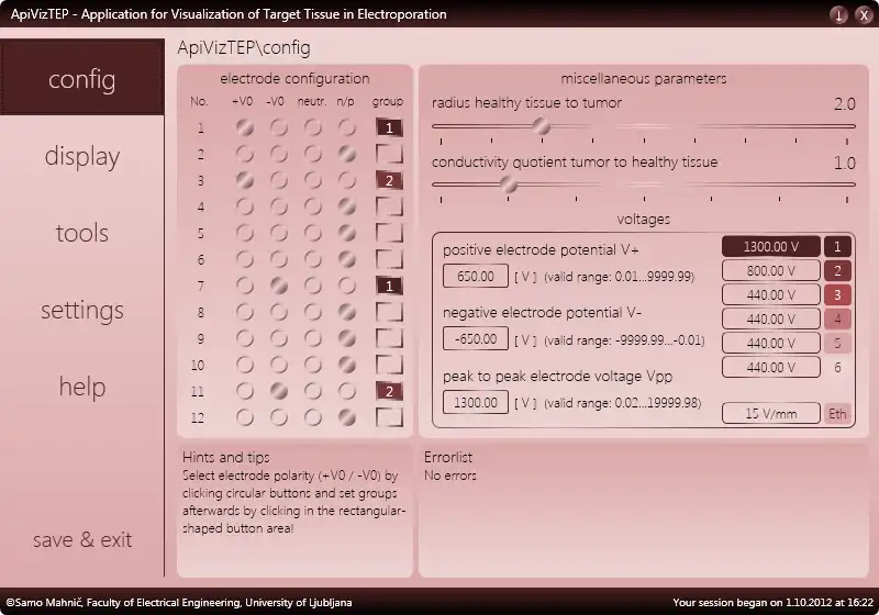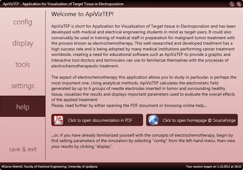 ApiVizTEP is short for Application for Visualization of Target tissue in Electroporation and has been developed with medical and electrical engineering students in mind as target users. It could also conceivably be used in training of medical staff in preparation for malignant tumor treatment with the process known as electrochemotherapy. This well-researched and developed treatment has a high success rate and is being adopted by many medical institutions performing cancer treatment worldwide, creating a need for educational software such as ApiVizTEP to provide a graphic and interactive tool doctors and technicians can use to familiarize themselves with the processes of electrochemotherapeutic treatment. The aspect of electrochemotherapy this application allows you to study in particular, is perhaps the most important one. Using analytical methods, ApiVizTEP calculates the electrostatic field generated by up to 6 groups of needle electrodes inserted in tumor and surrounding tissue...Audience