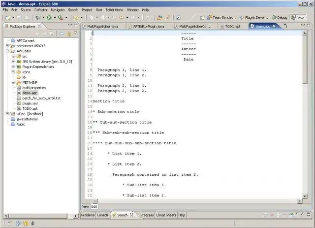 An Eclipse plugin for the APT (Almost Plain Text) format. Accelerates documentation by generating a formatted version of a (almost) plain text file.